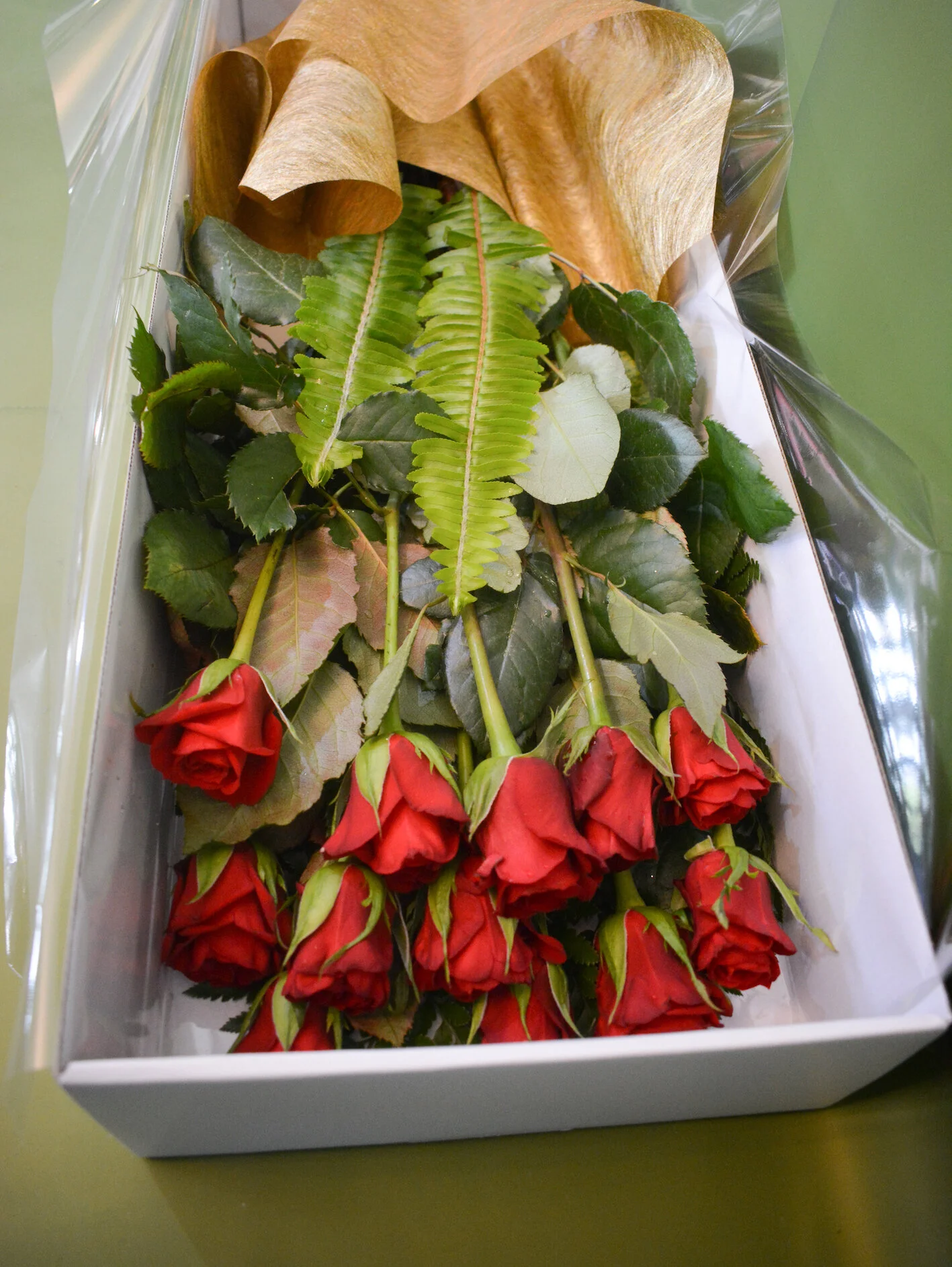 Beautiful long stem red roses in presentation box, available as one single stem, a dozen or two dozen.